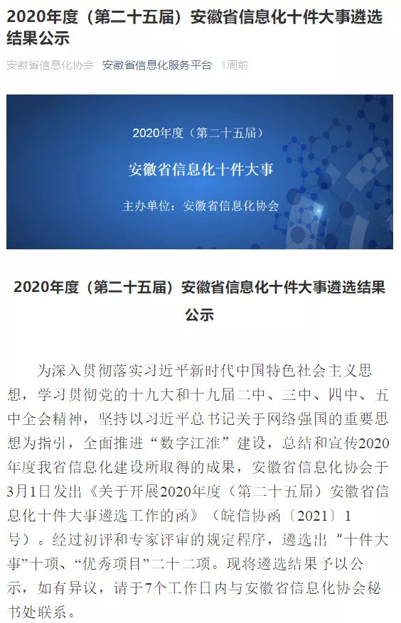 近日,安徽省信息化协会公示了2020年度(第二十五届)安徽省信息化十件大事遴选结果,万向娱乐信息申报的“芜湖市信息资源安全治理项目”经过初评和专家评审,成功入选2020年度安徽省信息化十件大事,标志着我公司信息化建设再上新台阶。