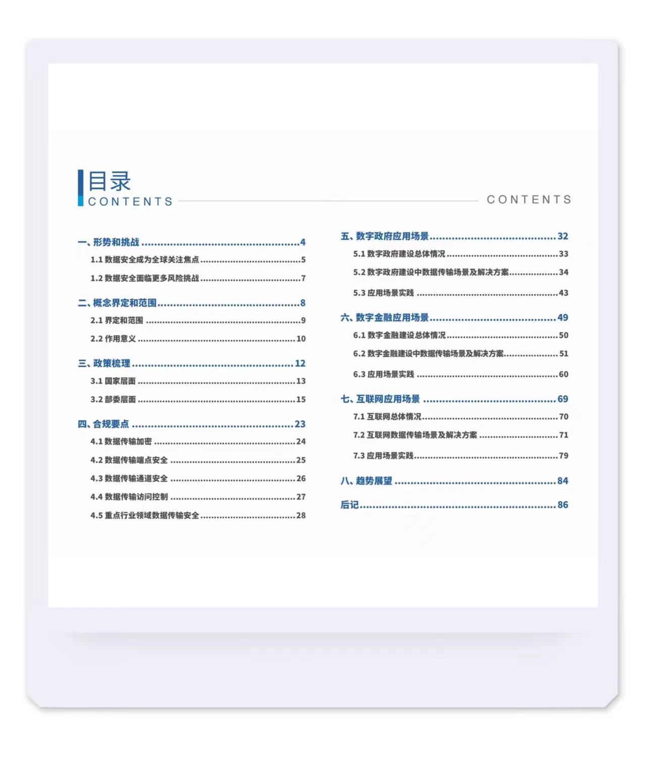 《白皮书》是在数字经济新机遇和新挑战时代背景下,由工业和信息化部网络安全产业发展中心(工业和信息化部信息中心)牵头组织编制,全文从“形式与调整”、“概念界定和范围”、“政策梳理”、“合规要点”、“数据政府应用场景”、“数字金融应用场景”、“互联网应用场景”、“趋势展望”等八个章节,阐述了近年来数据安全传递的趋势情况。具体内容可关注公司网站,下载详细版本