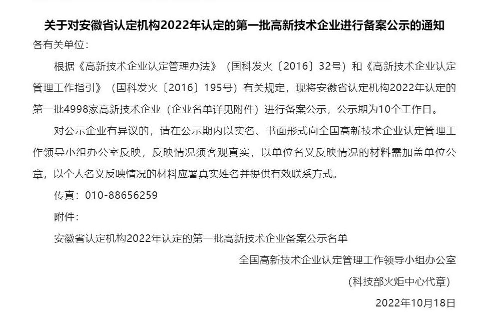 10月18日,安徽省认定机构对2022年认定的第一批高新技术企业进行了备案公示。安徽万向娱乐信息继2016年,2019年,第三次被认定为