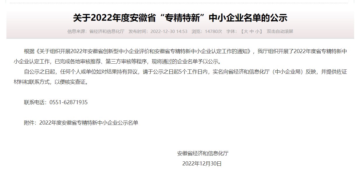 ? ? ? ? ?近日,安徽省经信厅公布了2022年安徽省“专精特新”中小企业名单。安徽万向娱乐成功通过审核,被认定为安徽省“专精特新”中小企业!