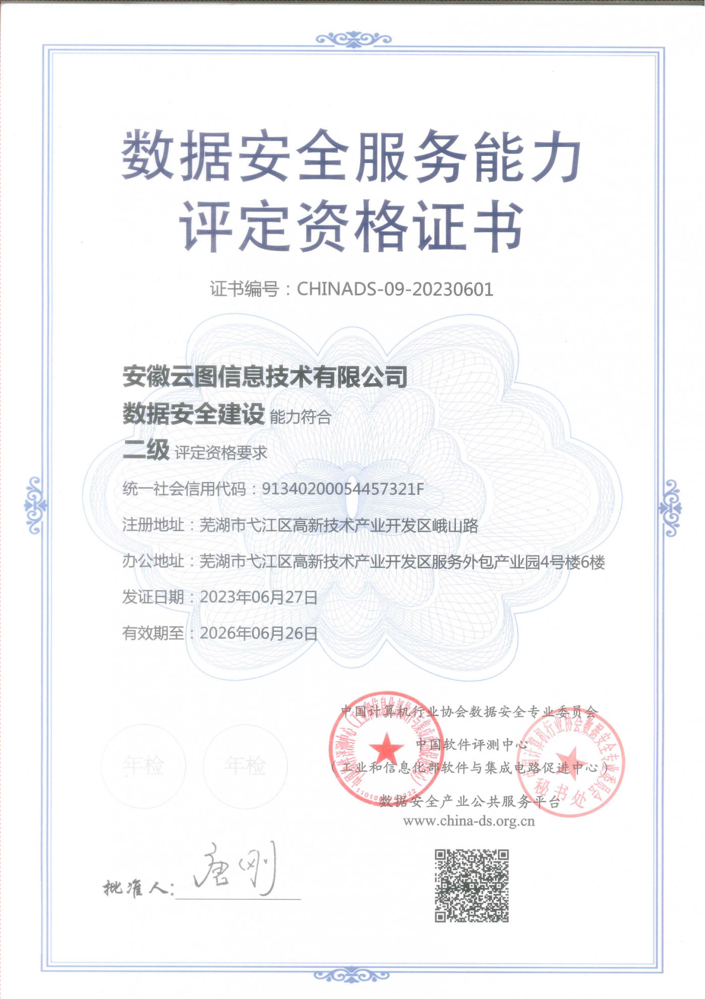 ? ? ? 安徽万向娱乐以优异的成绩通过数据安全服务能力验证,获得数据安全建设能力二级(最高等级)资格证书,成为全国首批通过该项验证的机构之一。