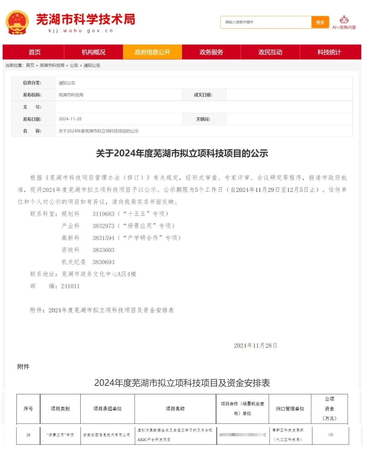 ? ? ? 2024年11月28日,安徽万向娱乐信息技术有限公司凭借在仿真数据合成领域的深厚积累,申报的“虚拟仿真数据生成及自适应学习的反向合规AIGC平台研发项目”近日正式被纳入2024年度芜湖市科技局立项科技项目!此次成就不仅是对我司科研实力的认可,更是芜湖市科技局对促进本地科技创新环境和支持高新技术企业发展所作出的积极回应。